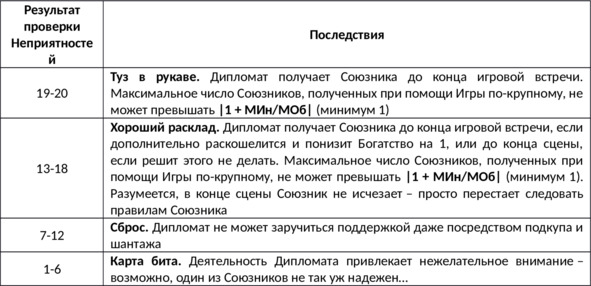 Если участие в игре большого количества статистов-агентов негативно сказывается на динамике событий, то можно ограничить возможности «Игры по-крупному», оставив Дипломату лишь доступ к достоинствам и Ходам его союзников. В этом случае Дипломат может использовать свои Нити при совершении Ходов союзников или применении их достоинств. По сути, Дипломат покупает временный доступ к Ходам и достоинствам других Атрибутов! Таким образом, Дипломат является источником Ходов и достоинств во всех отношениях, поэтому используйте значения его Характеристик в тех случаях, когда это необходимо.