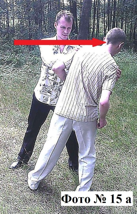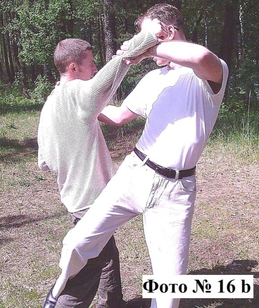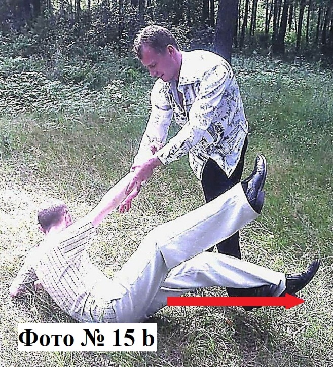 1). «Классическая подсечка» трудновыполнима на практике, но она эффективна на скользкой поверхности. Поэтому чтобы облегчить её выполнение, вам необходимо, держа противника двумя руками за плечи или одежду ударить его, например, своей правой ногой по лодыжке его левой ноги. А для, действительно, успешного выполнения этой подсечки, вам нужно ещё и предварительно направить своего противника в противоположную сторону от желаемой стороны (в которую вы хотите его опрокинуть), что вызовет у него естественное сопротивление – он предпримет усилие в нужном вам направлении Фото №№ 15a, 15b. Ноги же противника при этом вам необходимо выбивать быстро, даже можно сказать резко, чтобы он не успел ими переступить в устойчивую позицию.
