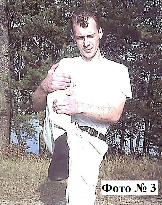 5). Очень важно, по крайней мере, очень желательно развивать у себя умение сохранять равновесие. Делается это достаточно простым способом. Поднимите согнутую в колене ногу и прижмите её обеими руками к своей груди Фото № 3, после чего простойте в таком положении секунд 20-30. А затем, не вставая на поднятую ногу, прижмите её рукой сзади и простойте так ещё 20-30 секунд (то же самое проделайте и со второй своей ногой).