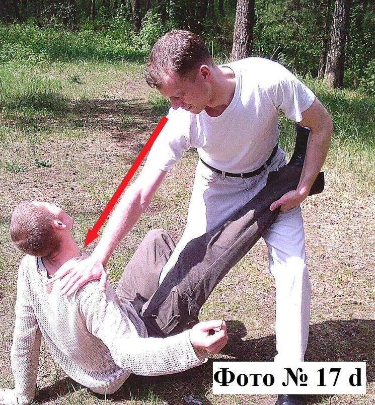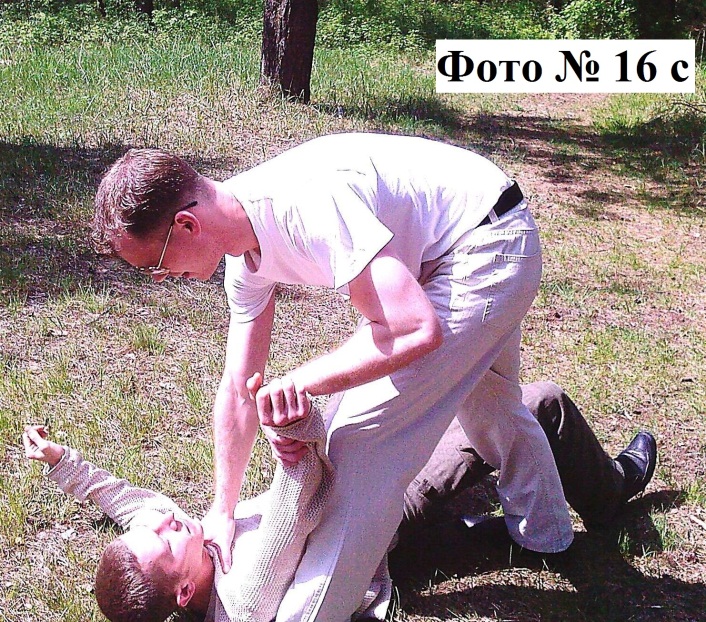 5). Ещё можно подсечь атакующего вас противника за одну его ногу, после того как вы отобьёте боковой удар его руки Фото № 16a. Выполнять эту подсечку необходимо быстро с одновременным толчком вашей рукой в горло нападающего Фото №№ 16b, 16c. После чего вы сможете нанести добивающий удар в голову. Этот приём простой, а значит, эффективный!