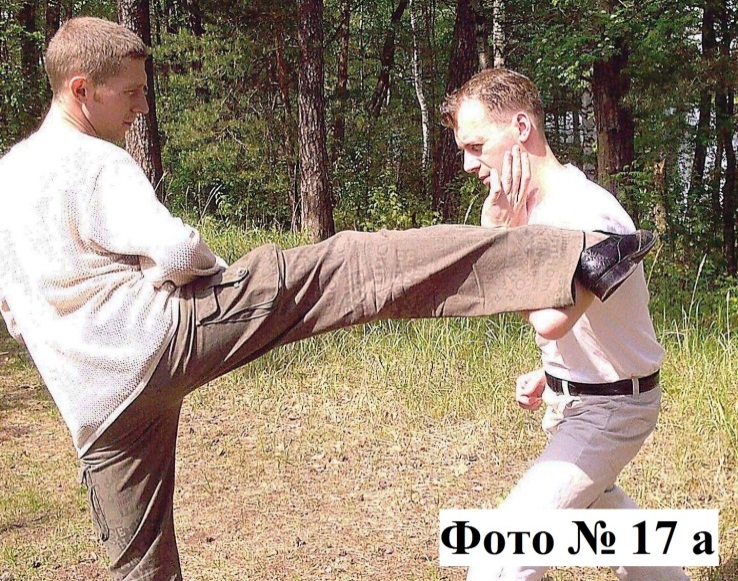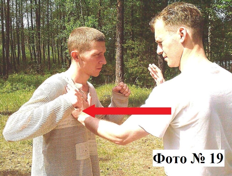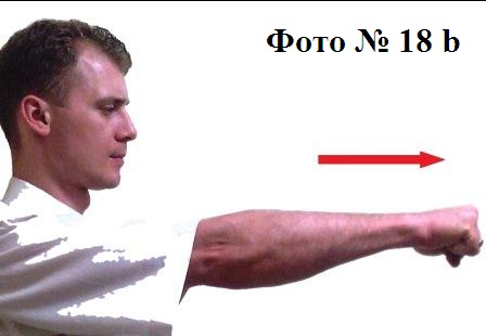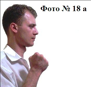 1). Прямой удар кулаком или ладонью применяется в ближнем бою и наносится в грудь, голову или солнечное сплетение. Если бьёте ладонью в солнечное сплетение, то во избежание перелома запястья (вследствие его перегиба) вам нужно присесть. При этом совершать прямой удар лучше отталкивающим движением руки быстро и резко Фото №№ 18a, 18b. Такой способ удара даст вам некоторое преимущество в скорости и неожиданности.