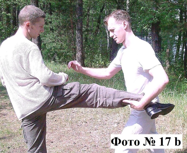 6). Также применение подсечки возможно и против удара ногой на уровне вашего корпуса/головы. Для этого вы сначала применяете блок с захватом ноги нападающего Фото №№ 17a, 17b, а затем делаете быстрый зацеп его ноги своей ногой, после чего вы толкаете его Фото №№ 17c, 17d.