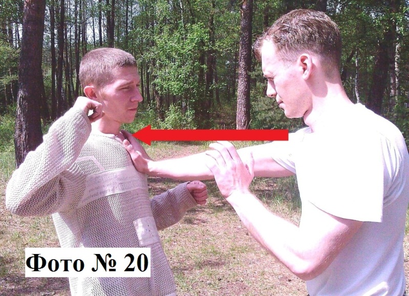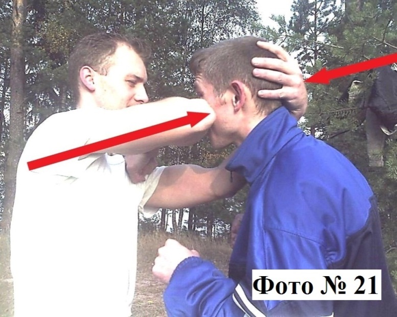 4). Удар локтём в голову с одновременным её подтягиванием к себе (вашей второй рукой) Фото № 21. Так вы гарантировано попадёте в цель.