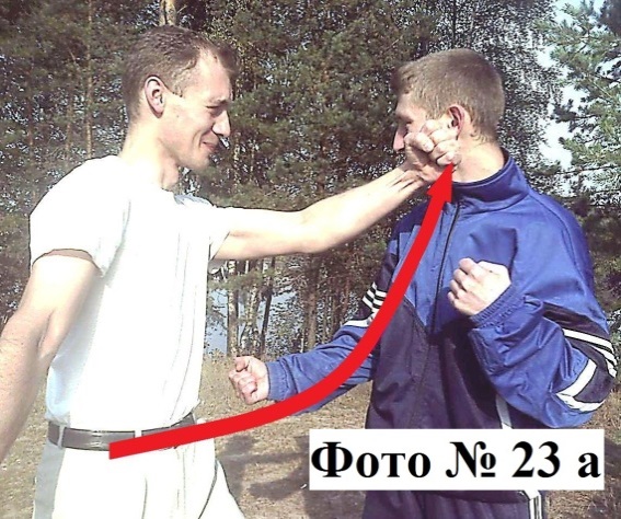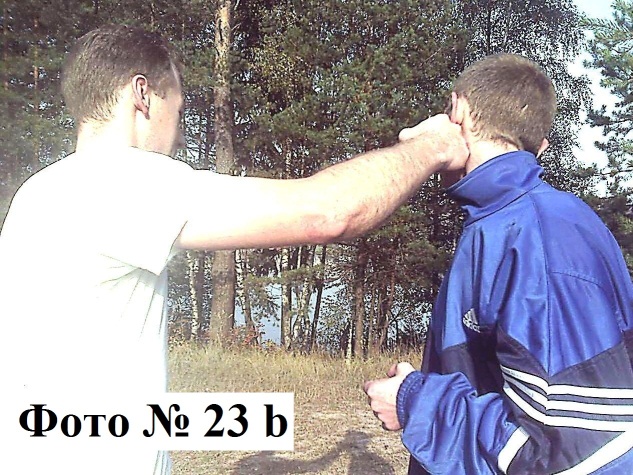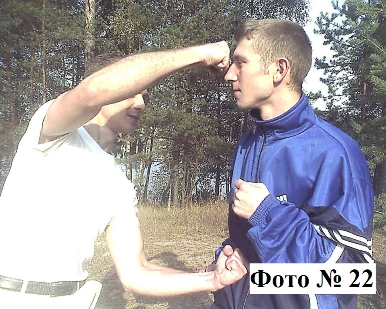 6). Можно бить и двумя руками любым удобным для вас способом как одновременно Фото № 22, так и поочерёдно. Сначала наносите удар тыльной или внешней стороной кулака одной руки Фото № 23a, а затем следом за первым ударом сразу же наносите второй удар кулаком или ладонью другой вашей руки Фото № 23b. Или же бьёте локтём (на ваш выбор) Фото № 24.