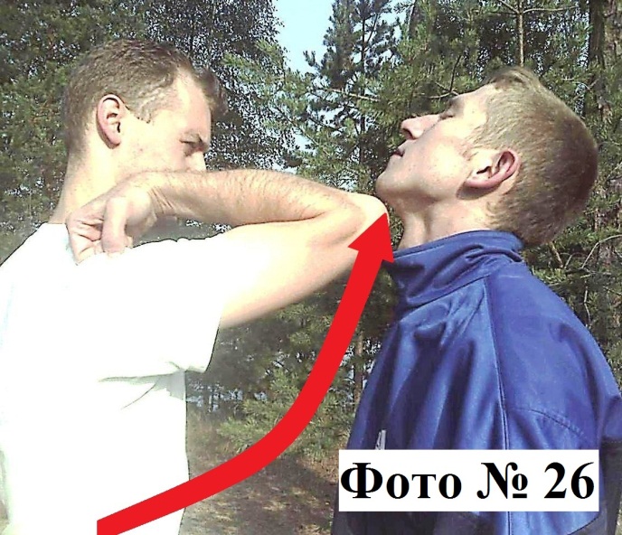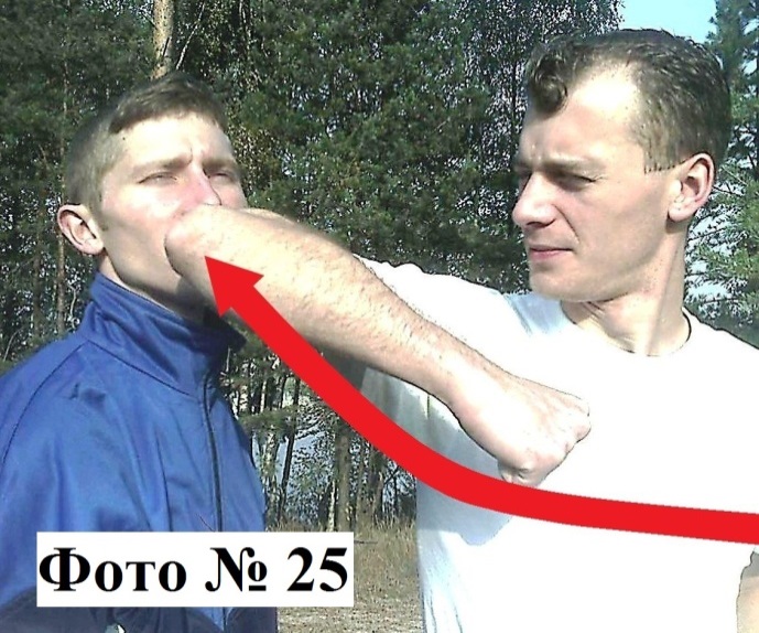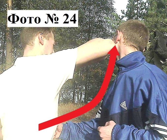 8). Удар снизу в подбородок/корпус кулаком (апперкот) или локтём, всегда достаточно мощный, а значит, эффективный Фото № 26.