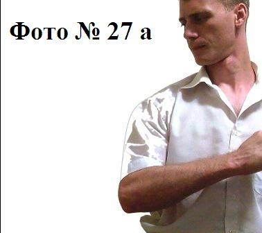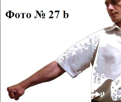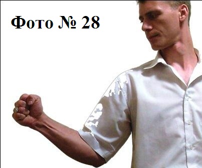 9). Удар тыльной стороной кулака в противника, который стоит сбоку от вас (наносится вами в живот или в пах) Фото №№ 27a, 27b. Или наносится внешней стороной кулака в солнечное сплетение противника Фото № 28.