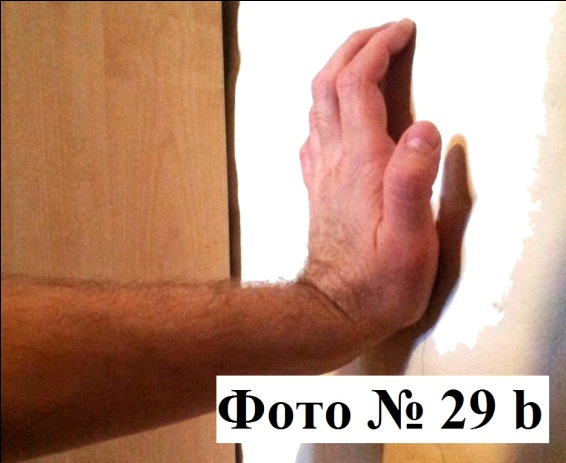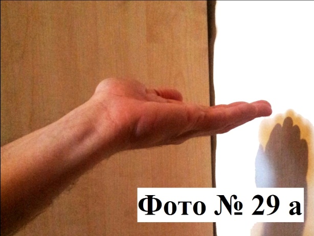 12). Бывают ситуации, когда необходимо нанести удар с минимального расстояния, в них нужно использовать «Короткий удар», суть которого состоит в отсутствии размаха как такового. Для его совершения вам необходимо бить нижней частью ладони, вкладывая в удар как бы «внутреннюю инерцию» совершаемого вами удара (от локтя вашей руки). А для контроля расстояния используйте предварительно выпрямленные пальцы Фото №№ 29a, 29b.
