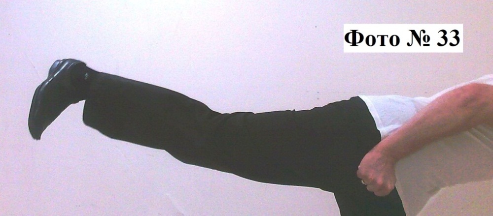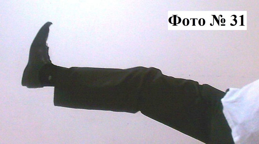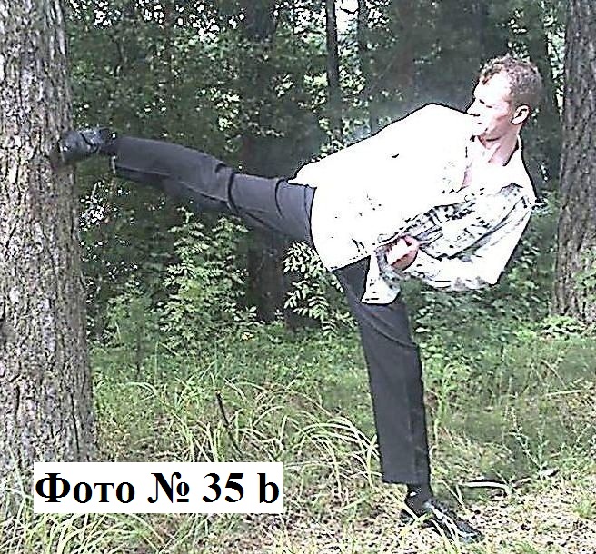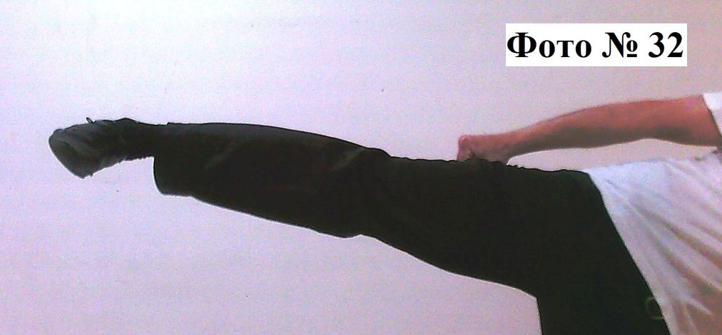 2). Контратакующий удар всей стопой или пяткой, наносится в корпус атакующего вас противника. Совершается быстрым подъёмом согнутой в колене ноги с последующим резким отталкивающим движением Фото № 31.