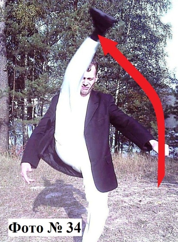 6). Рубящий удар пяткой (сверху вниз), для его совершения вам необходимо как при растяжке, сначала взмахом ноги вывести пятку на исходную позицию (вверх), а затем обрушить её на противника, например, в ключицу. А чтобы вам этот удар дополнительно (дабы он и без того мощный) усилить, его лучше произвести по дуге, то есть изнутри наружу Фото № 34.