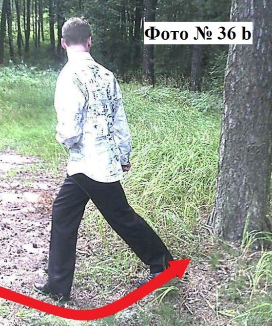 Второй способ: опорной ногой вы переступаете вперёд за бьющую ногу Фото №№ 36a, 36b, 36c.