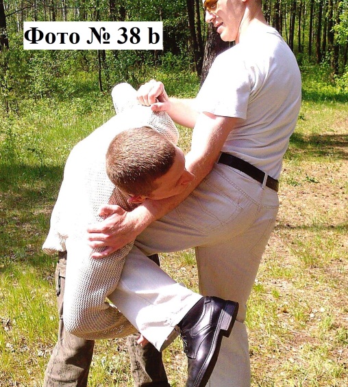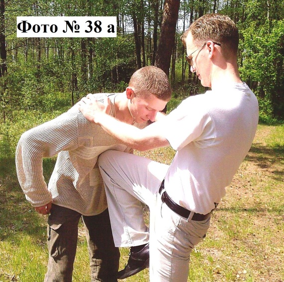 9). Удары коленом в корпус или пах противника. Лучше всего наносить, раскачивая противника вперёд-назад или просто в стороны. В этом случае вашему противнику будет значительно труднее сопротивляться вашим ударам Фото №№ 38a, 38b.