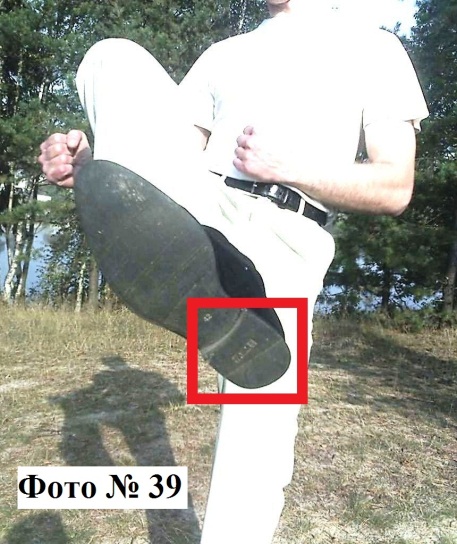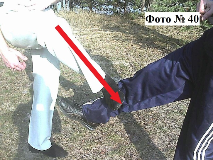 10). Удар выставленной пяткой (изнутри наружу) Фото № 39. Он же применяется и как блок против ударов ногами противника снизу Фото № 40.