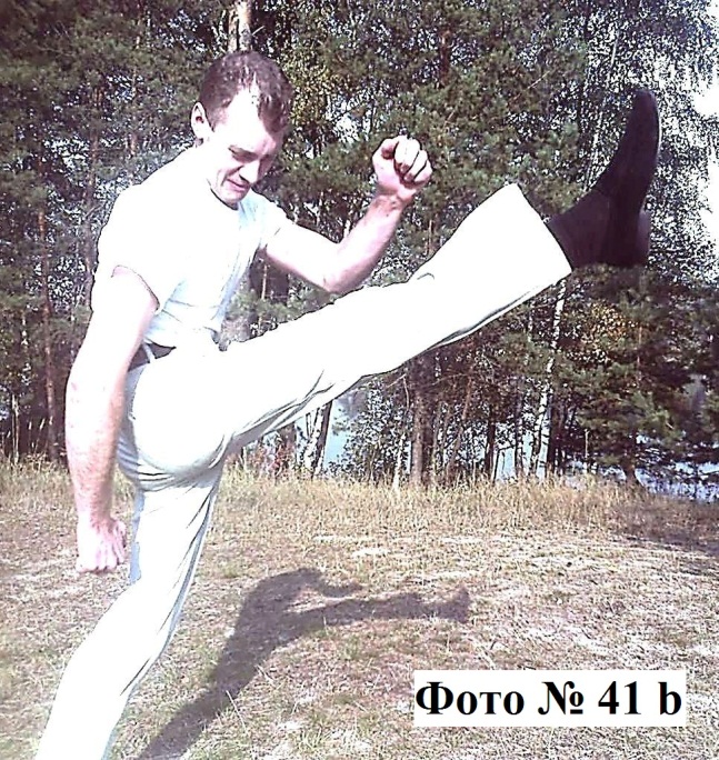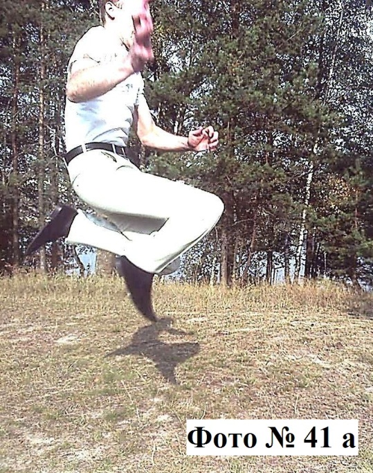 11). Отталкивающий удар ногой в прыжке с места, совершается подушечками под пальцами ног. Для его усиления вам во время прыжка вторую ногу желательно постараться отвести назад Фото №№ 41a, 41b.