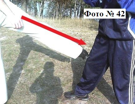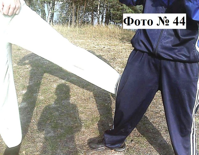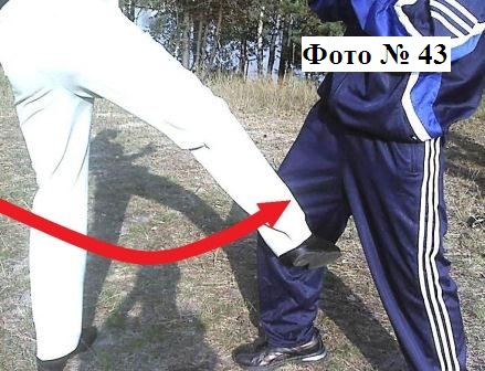 12). Боковой удар ногой в колено Фото № 42 с последующим его переломом (на ваше усмотрение). А также Фото №№ 43, 44, которые должны совершаться вами как бы «выбрасывающим движением» вашей ноги.