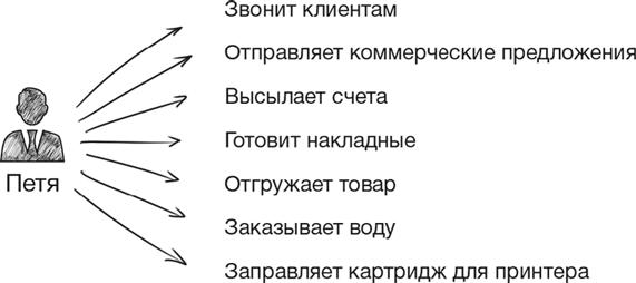 Раньше я видел свою компанию следующим образом. Например, у меня есть сотрудник Петя, он звонит клиентам, отправляет коммерческие предложения, выставляет счета, готовит накладные, отгружает товар, заказывает воду, заправляет картридж для принтера.