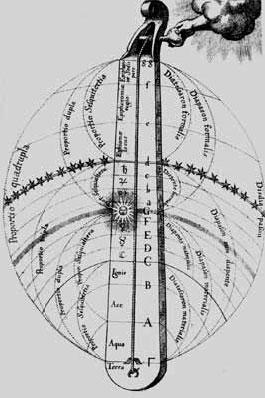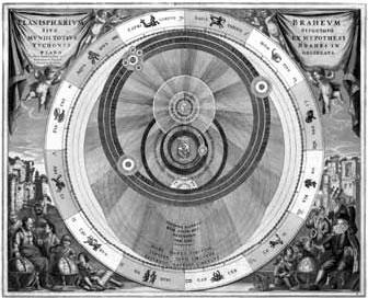 Еще одну «конфигурацию мироздания» предлагала система Тихо Браге, выдвинутая им в 1580 г. (и восходящая в конечном итоге к древней системе Гераклида Понтийского): вокруг Земли обращаются Луна и Солнце, последнее же при этом является центром для вращения прочих планет. В XVI–XVII вв. эта система имела довольно много сторонников: во первых, Браге пользовался высочайшим авторитетом как астроном-практик, во вторых, она позволяла совместить геоцентрическую модель Вселенной с представлениями об особом статусе Солнца: согласно герметическим воззрениям, столь популярным в ту эпоху, дневное светило ассоциировалось с олицетворением божественности, явленным человеку в чувственном мироздании.[53]
