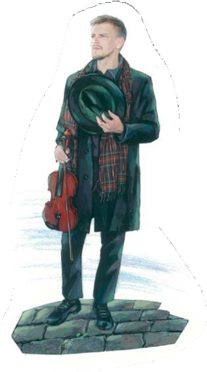 – Браво, браво, скрипач Даниэль! – раздалось снизу. Кто это там? Друзья глянули с крыши вниз. О, да это же Бургомистр их города, очень доброжелательный и оригинальный человек! Он стоял посреди заснеженной улицы, задрав вверх седую непокрытую голову, и махал им рукой. В другой руке держал связку ключей и жестяную масленку, чтобы смазывать старинные городские двери и ворота.