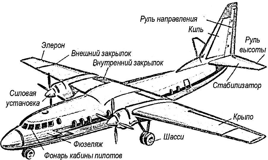 Самолёт имеет следующие основные части : фюзеляж, на котором укреплены крылья с элеронами, шасси с колёсами ; в задней части фюзеляжа имеется хвостовое оперение, состоящее из киля с рулём поворота , и стабилизатора с рулём высоты ; в передней части установлены моторы с винтами . Такие же части имеют и модели самолётов .