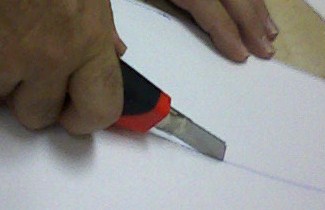 Резать пенопласт нужно острым канцелярским ножом, делая как можно меньше угол между лезвием и плоскостью панели. (см. фото) Тогда края будут ровными и не рваными.
