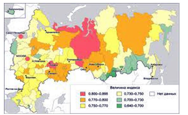 Рис. 7.4. Индекс развития человеческого потенциал субъектов РФ (2009 г.)
