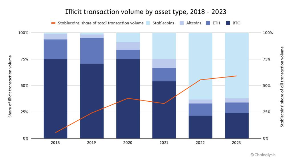 По данным одной аналитической компании Chainalysis, объём операций связанных с незаконной деятельностью в 2023 году составил $24,2 млрд, объём незаконных доходов за тот же период составил 29,2% от криптомошенничества, 54,3% от взломов и хакерства. Доля незаконных транзакций всего 0,34%, а объём санкционных средств уже $14,9 млрд (61,5% от незаконных операций).