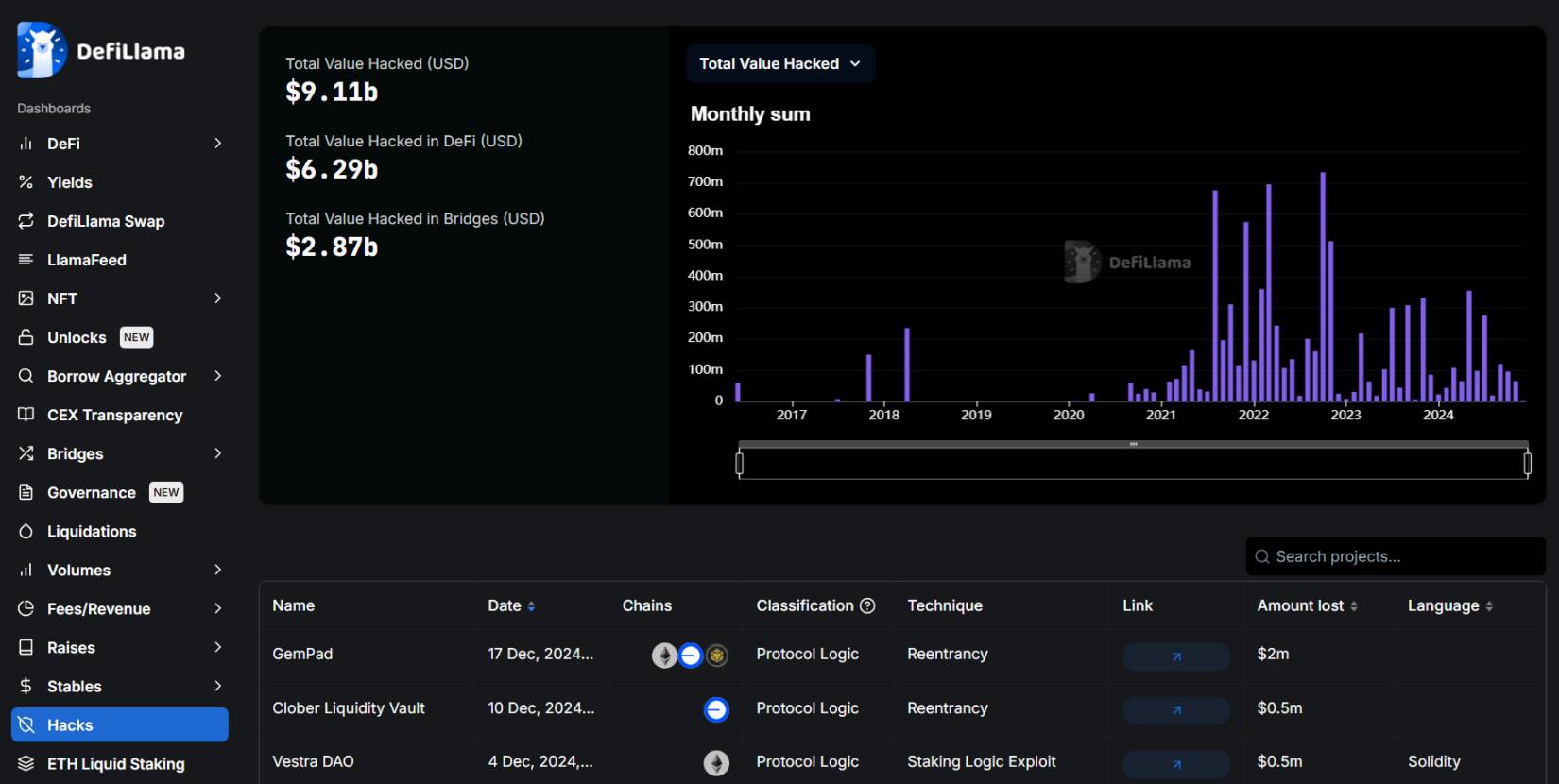 По данным аналитического ресурса DeFiLlama (на 25.12.2024), общая сумма убытков пользователей в секторе криптовалют составляет $9,11 млрд. При этом, доля взломов и хищений DeFi – $6,29 млрд, а доля кроссчейн мостов – $2,87 млрд.