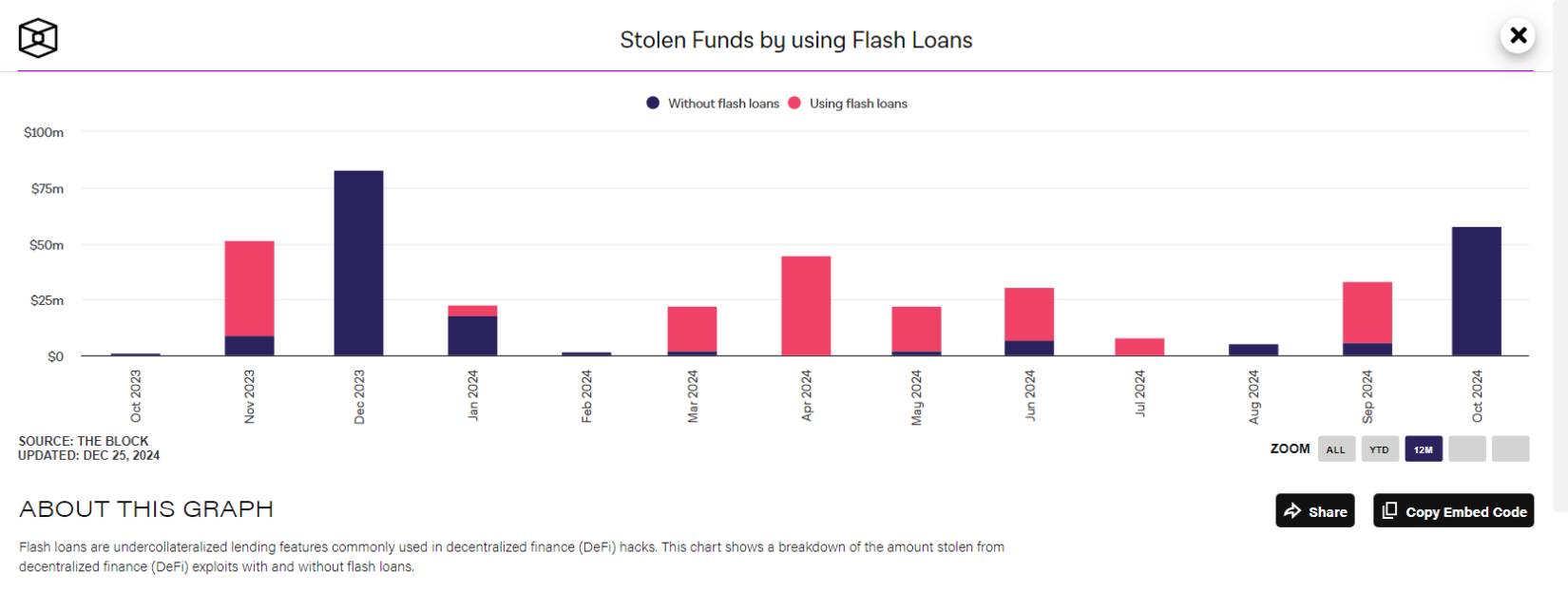 По данным сервиса TheBlock, в сентябре 2024 года уровень хищений с использованием мгновенных займов составлял $27 млн23.