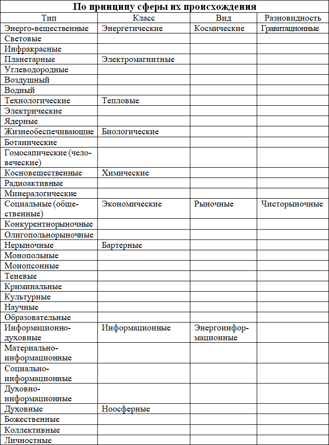 Поскольку по определению Альберта Эйнштейна: «Наука есть не что иное, как упорядочение мышления», обмены должны быть классифицированы. Анализ показал, что критерием классификации обмена следует выбрать сферу, в которой они происходят, поскольку специфическая сфера обмена обусловливает и особенность их осуществления. По этому критерию обмены можно разделить на следующие типы: энерго-вещетсвенные, общественные (социальные) и информационно-духовные. Классификация обменов по признаку «сфера обменов» ниже представлена в форме таблицы 1.