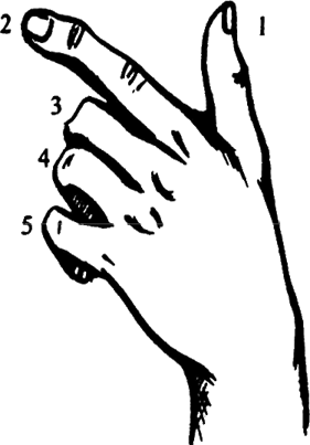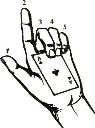 Пальмированием называется скрытое удерживание изъятой из игры карты в ладони. В процессе игры иногда внезапно и незаметно исчезает, временно конечно, одна или несколько карт. Пропавшая карта помещается тут же, в руке, в правой или в левой, в зависимости от обстоятельств. Карта располагается по длине вдоль руки и удерживается пальцами, например левой руки, № 3, № 4 и № 5, согнутыми соответственно для этой цели не до конца, а так, как показано на рис. 12. Пальцы № 3, № 4, № 5 крепко прижимают карту к ладони и не дают ей выскочить из ладони ни влево, ни вправо. Пальцы № 1 и № 2, большой и указательный, свободны и могут спокойно продолжать игру. На рис. 12 показано положение левой руки с картой в рабочем состоянии, вид сверху.