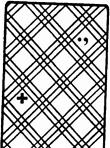 Эта система крапления более заметна, чем предыдущие системы, но зато легче запоминается, а процесс идентификации карт происходит намного быстрее. Смотрите примеры использования этой системы на рис. 34.Туз треф (точка – это туз, а знак равенства – это трефы); рис. 35.Дама пик (три точки – это дама, а тире – это пики); рис. 36;Семёрка бубен (точка с запятой – это семь, а плюс – это бубны) рис. 37.Десятка черв (запятая – это десятка, а х – это червы
