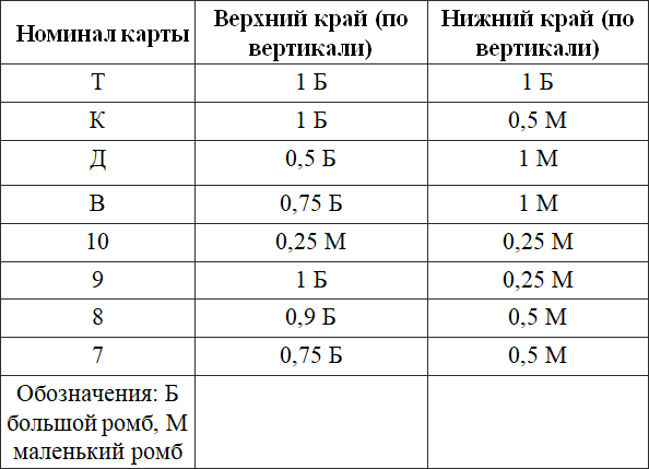 Рис. 25. Система крапления двумя точками – вверху масти (пики, трефы, бубны, червы), в центре карты – ромб с обозначениями номиналов карт.