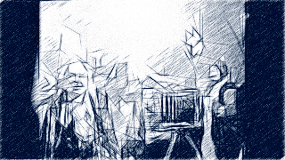 Старик возвращается в круг, таща старый фотоаппарат на треноге с магниевой вспышкой. Устанавливает аппарат, направляет, и опять норовит включиться в танец… Танец набрал силу и скорость и старик не может попасть в такт Его движения заторможены, руки и ноги плохо скоординированы, булькающее дыхание душит его…
