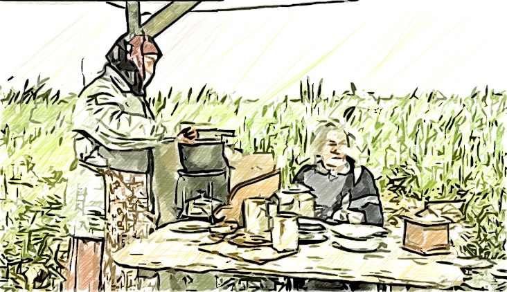 Оба немца мелко закивали головами. Длинный суетливо достал из кармана три папиросных окурка, выпотрошил их в газету, скрутил и заклеил языком. Беззубый что-то сказал, взял у длинного самокрутку, начал шарить вокруг глазами. Засеменил к развалке, выдернул из кучи камышовую хворостину, шепелявя, разлезшимися в улыбке, губами подошёл к навесу, протянул хворостину к примусу.