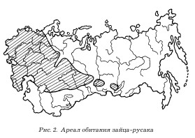 Кончики ушей темные, почти черные. Общая окраска шерсти желтовато-палево-коричневатая, сероватые бока и более светлое брюхо и шея. На спине чубарый ремень, или седловина. Зимой заяц значительно светлеет (иногда даже белеет), но никогда не становится полностью белым. Цвет зимнего наряда во многом зависит от постоянного местообитания: от того, открытые это заснеженные поля или темные бурьяны. Ярко выражен подшерсток, имеющий слегка вьющийся остевой волос. Длинные задние лапы покрыты густой прилегающей шерстью средней жесткости. Скорость бега русака выше, чем у беляка, и достигает 50 км/ч. Русак – изначально степное животное, но широко распространен и в зоне лесостепи. С развитием сельского хозяйства и в связи с вырубкой лесов ареал русака значительно расширился (рис. 2).