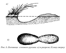 Немало русаков селится по опушкам лесов и в кустарниках. Искусственно и довольно успешно расселяли русаков в Новосибирской, Кемеровской, Читинской областях, в Алтайском, Красноярском, Хабаровском краях, хотя не везде они достигли значительной численности. В северных частях ареала русаки крупнее, чем в южных. Русак ведет оседлый образ жизни, упорно предпочитая те места, где появился на свет. Ложится русак на ночь в радиусе 400 м от прежней лежки, и, лишь многократно напуганный преследованием, он навсегда покидает эти места. Вспугнутый, например, на стерне заяц на следующий день сюда не вернется, а отлежится в лесополосе или лесопосадках, но через день будет на прежнем месте. В степной полосе в бескормные зимы зайцы иногда массово перекочевывают в поисках корма. Пока позволяют высота и рыхлость снежного покрова заяц будет кормиться на озимых. При крепком насте или очень высоком снежном покрове становится он вредителем садовых деревьев или жирует по краям лесополос и лесных массивов. С наступлением оттепели возвращается к любимому корму. На твердом грунте ложится, не устраивая логова, а в рыхлом выкапывает ямку глубиной около 8 см и ложится, опустив голову на вытянутые передние лапы и прижав уши. Тонкий слух позволяет ему постоянно контролировать окружающую обстановку (рис. 3).