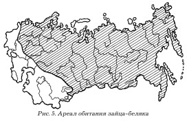 Область распространения чрезвычайна широка, на территории России обитает практически повсеместно и, кроме тундры, куда зайцы предпринимают сезонные миграции, живет оседло, меняя только места кормежек в зависимости от сезона (рис. 5).