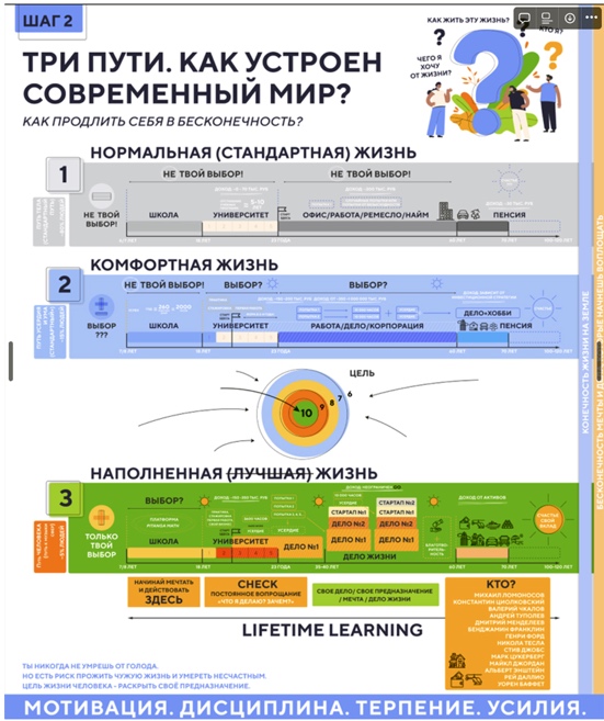 Про первый путь вы либо уже сами знаете, либо вам про него с удовольствием расскажет общество. Стандартный путь. Так же все живут! Так положено! По нему идут 90% людей на Земле. Его коротко можно описать так: ясли, детский сад, школа, университет, нелюбимая работа, дешёвый автомобиль и маленькая квартира в кредит, пенсия, могила. Всё, ты умер. Самое главное, что характеризует этот путь – это отсутствие выбора на каждом из участков пути. Школу и класс в ней выбрали за вас. Университет выбрали за вас родители – или вы пошли туда, куда смогли поступить, куда хватило баллов, куда было модно, куда пошли ваши друзья. Закончив университет, вы начали искать работу – или вам помогли устроиться на неё. И здесь зачастую это тоже был не ваш выбор. 75% выпускников ВУЗов не работают по специальности. Причин этому много, но основные следующие: 1) вас не берут без опыта или предлагают очень низкую зарплату; 2) вам самим неинтересно работать по специальности, т. к. это был не ваш выбор; 3) профессия в текущий момент не так востребована, как раньше, и количество выпускников превышает потребность работодателей. Т. к. выбор сделали за вас или вы устроились, куда была возможность – скорее всего, эта работа не приносит вам радости и не даёт раскрыться вашим сильным сторонам. Работая на такой работе, вы – скорее всего – всю жизнь будете получать среднюю зарплату и, может быть 2 или 3 раза за жизнь, сделаете карьерный переход в другие компании. Чем плох этот путь? И ничем и всем. Я не осуждаю людей, которые его выбрали. Ведь выбрали они его по незнанию. А за незнание нельзя осуждать. До 2000-х годов он неплохо работал, но сейчас во всем мире стали сыпаться социальные институты, растет инфляция, увеличивается число заболеваний раком, возникают эпидемии – и совокупно пенсии и накоплений вам может не хватить, чтобы элементарно обеспечить себя, не говоря уже о детях и родителях. Плох он также тем, что люди страдают, не реализовывая свой потенциал. Даже если сами не понимают, что страдают именно от этого.