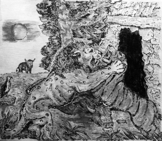 …До долгожданного утёса с пещерой оставалось совсем немного пути, когда дорогу мне ленивой поступью перешёл дикобраз. Я чуть было не накололся на его острые шипы, растопыренные вокруг тела зверя во все стороны. Если бы это случилось, то судьба моя была бы предрешена не в лучшем смысле этого слова. Спустя ещё какое-то короткое время на пути к пещере я повстречал своего соседа – длиннотелого, пёстро окрашенного гигантского питона, жившего рядом со мной в одной из трещин базальтовых пород. Большой Змей как-то странно и сочувственно посмотрел на меня своими крохотными немигающими тёмными глазками, едва приподняв над почвой свою плоскую голову. После этого питон, обремененный своими заботами, поспешил удалиться, совершая при этом извивающиеся волнообразные движения. Смутное чувство тревоги закралось в львиное сердце. Внезапная встреча с дикобразом, с его арсеналом разящих острых игл всегда являлась для хищника любого размера дурным предзнаменованием, поскольку могла, в случае контакта с этим животным, привести к непоправимым последствиям. О, сколько я знал крупных кошек, медведей и многих других животных, которые навсегда остались инвалидами, так и не освободившись от обломков его игл, сколько их умерло от голода, утратив возможность полноценной самостоятельной охоты, и сколько поэтому стали жертвами других хищников и падальщиков – пернатых стервятников, гиен, диких собак, шакалов и им подобных… А тут ещё и питон-сосед с его подозрительным взглядом, не сулящим ничего хорошего. Надо бы поторопиться.