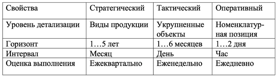 Процесс управления производственным предприятием может быть условно разбит на три уровня управления, характеризующиеся собственным набором задач, различными периодами планирования и разным уровнем детализации (таблица 1.1).