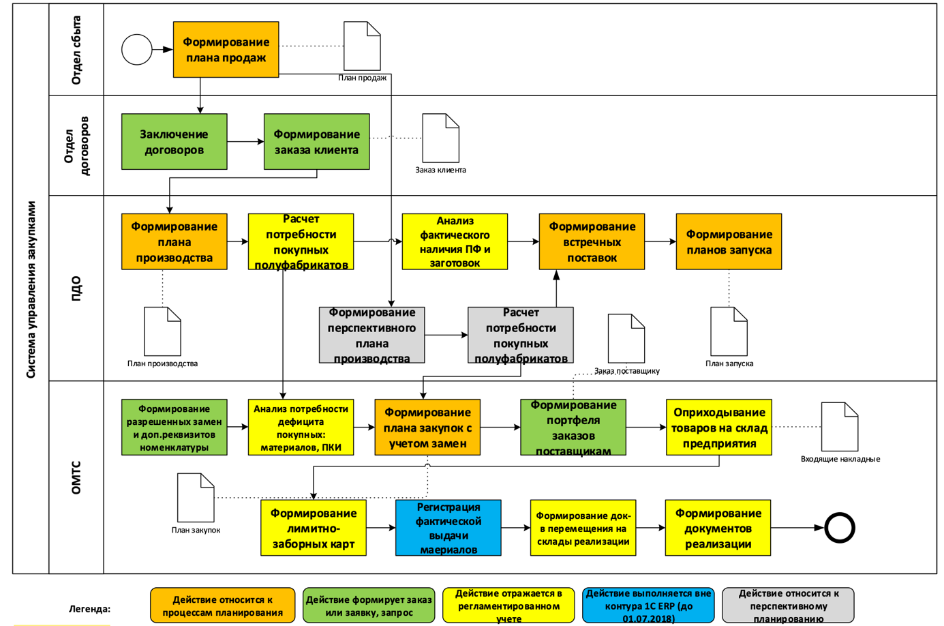 Ниже приведен простой пример диаграммы BPMN, описывающей общую схему процесса сквозного планирования предприятия от продаж до закупок и снабжения.