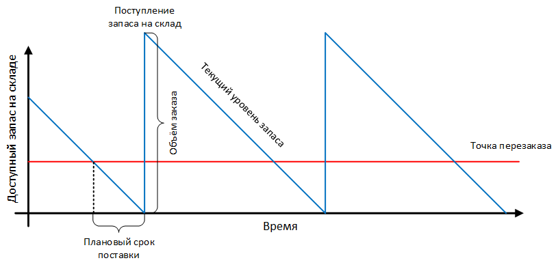 Ежедневно, чаще всего в ночные часы, на складе выполняется замер текущего уровня запаса продукции. Если значение запаса ниже точки перезаказа, запускается процедура пополнения, допустим, через закупку от поставщика или же заказ в производство.