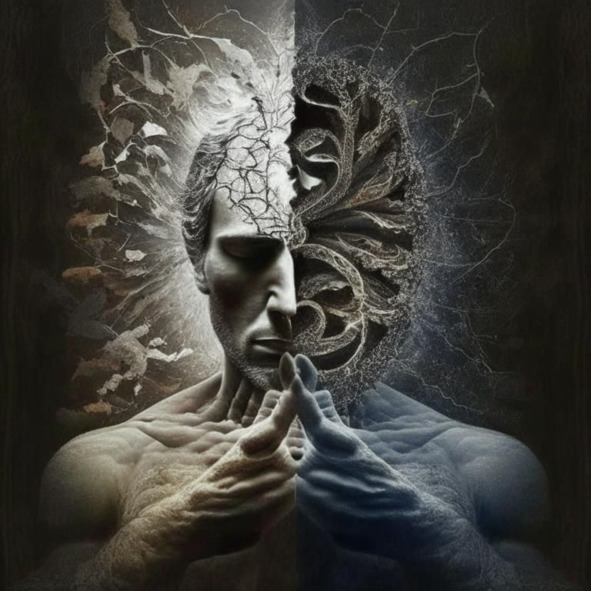 Разум, палец о палец не ударив, находится в присутствии «самого себя» и наблюдает, как отделяется от него самого же «цельного» частичка, которая «по подобию» и образу не отличается от «себя единого» и трансформируется в этой цепочке природно эволюционного фона в сушь, назвав себя Человеком.