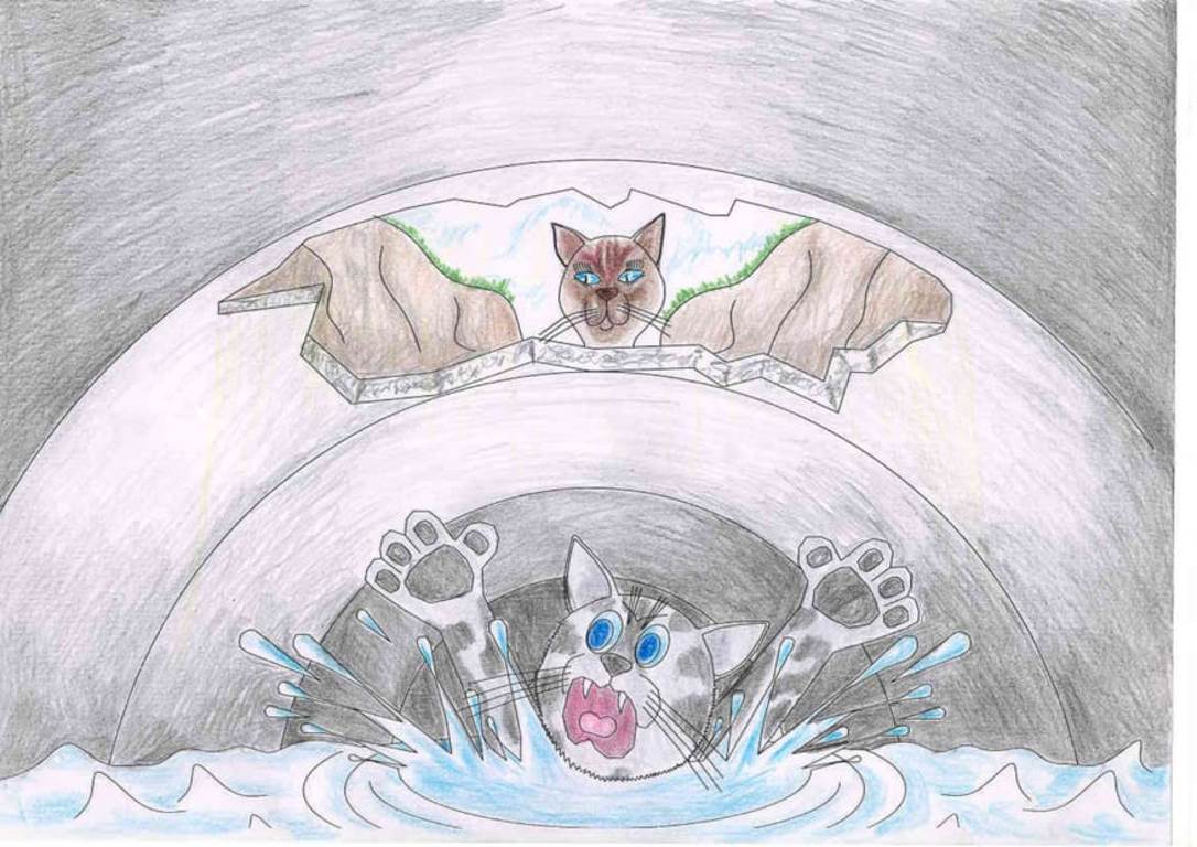 Луиза без слов пихнула его лапой в грудь. Васька вскрикнул. Он успел перевернуться лапами вниз, прежде чем нырнуть в воду. Выскочив на поверхность, Васька взвыл от ужаса. Потоком его несло по трубе во тьме в неизвестном направлении. Он глотнул теплой воды, закашлялся, забился и вновь нырнул, захваченный потоком. Его вопли далеко разносились по трубе. Впереди во мраке забрезжил свет. В душе появилась слабая надежда, что он сможет выбраться. Внезапно его выбросило на старый деревянный столб, почерневший и растрескавшийся. Жмурясь от света, Васька вцепился в древесину когтями и рванулся вверх как ошпаренный. В одно мгновение он выскочил из ямы на траву и стоял, тяжело дыша, с вытаращенными глазами. К яме как ни в чем не бывало подошла Луиза.