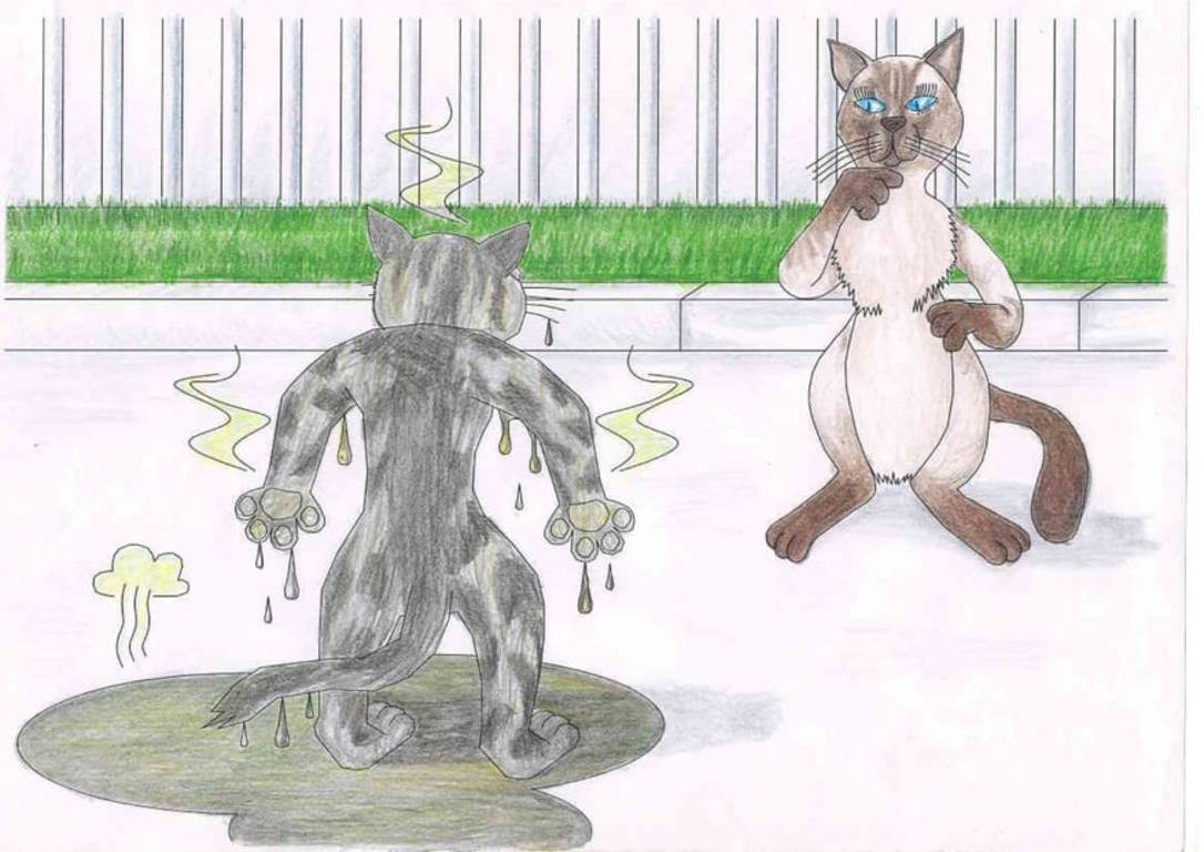 Васька заметался вдоль забора. Оглянулся, увидел приближавшихся котов и в отчаянии бросился в грязную лужу у мусорных контейнеров и стал валяться в ней, перемазавшись с хвоста до кончиков ушей. Нападавшие замерли в нерешительности, наблюдая эту картину.