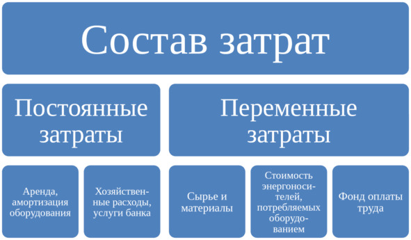Состав затрат – это все расходы предприятия в рамках производства и сбыта, которые несет предприятие. Обычно подразделяются на постоянные и переменные. Это же разделение потом присутствует в бухгалтерском учете и налогообложении. Под постоянными затратами обычно понимают неизменяемые затраты, не зависящие от объема производства, такие как аренда, связь и пр.