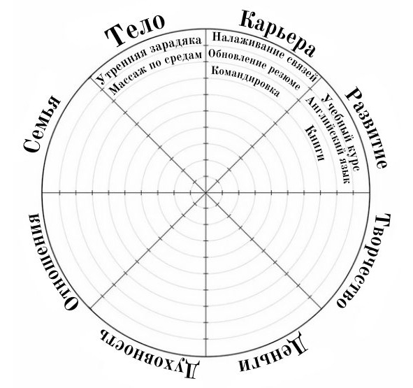 Проанализируйте подобным образом все ваши сферы жизни. И сделайте в секторе «Тело» столько же пунктов, сколько в самом заполненном секторе.