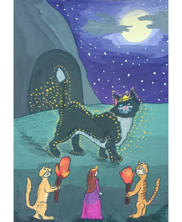 – Очень просто, Ваше Величество, – промолвил старик, – вам надо проследовать вдоль Кошачьего озера на южный его берег, пока не увидите, как равнина превращается в холмы. Найдёте самый высокий холм. В нём пещера. В этой-то пещере и живёт кошачий царь.
