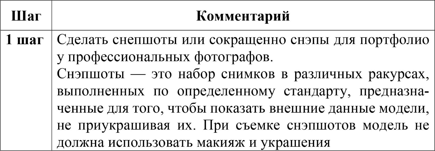 Все модели хотят иметь крутое портфолио, потому что без портфолио нет шансов на контракт, например, с зарубежным модельным агентством. Есть широко известные в мировой практике шаги для создания крутого портфолио, которые представлены в таблице 1.