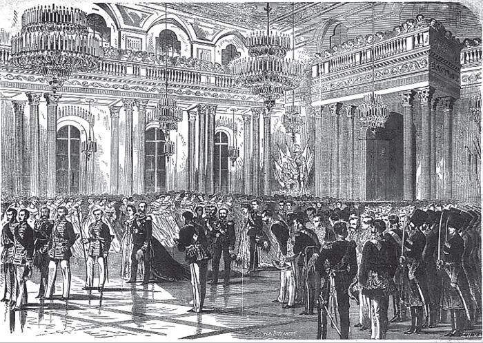 28 октября (9 ноября) 1866 года состоялось торжественное бракосочетание великого князя Александра Александровича и великой княжны Марии Федоровны. В восемь часов утра со стороны Петропавловской крепости прогремели пять пушечных выстрелов, возвещавших об этом знаменательном событии в истории России. К двенадцати часам дня в Зимний дворец съехались члены Святейшего синода и придворное духовенство, члены Государственного совета, сенаторы, статс-дамы, камер-фрейлины, гофмейстерины, фрейлины, придворные чины и кавалеры, чужестранные послы и посланники, генералы армии и флота.