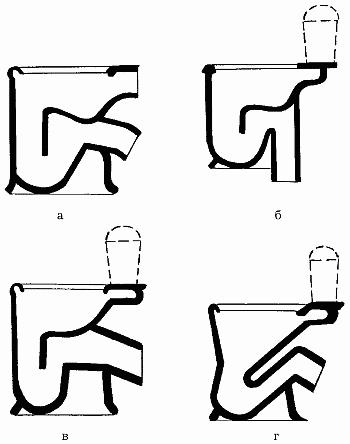 Рис. 2. Виды унитазов: а – с высоко расположенным бачком; б – с низко укрепленным плоским бачком и S-образным сифоном (косой выпуск); в – с низко укрепленным низким бачком и P-образным сифоном (прямой выпуск); г – с бачком на унитазе и Р-образным сифоном с насосом в сливной трубе.